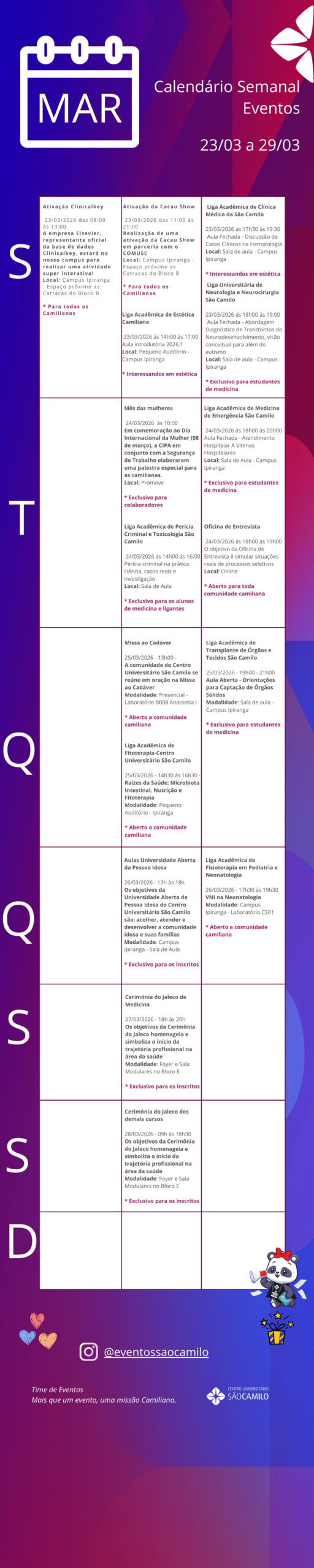 Calendário Semanal dos Eventos