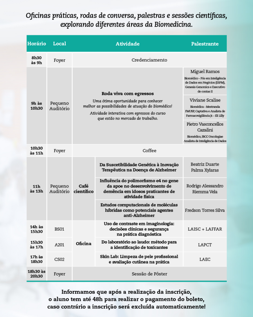 Um dia completo com oficinas práticas, palestras, rodas de conversa e sessões científicas para explorar as diversas áreas da Biomedicina e se conectar com profissionais do mercado 🔬